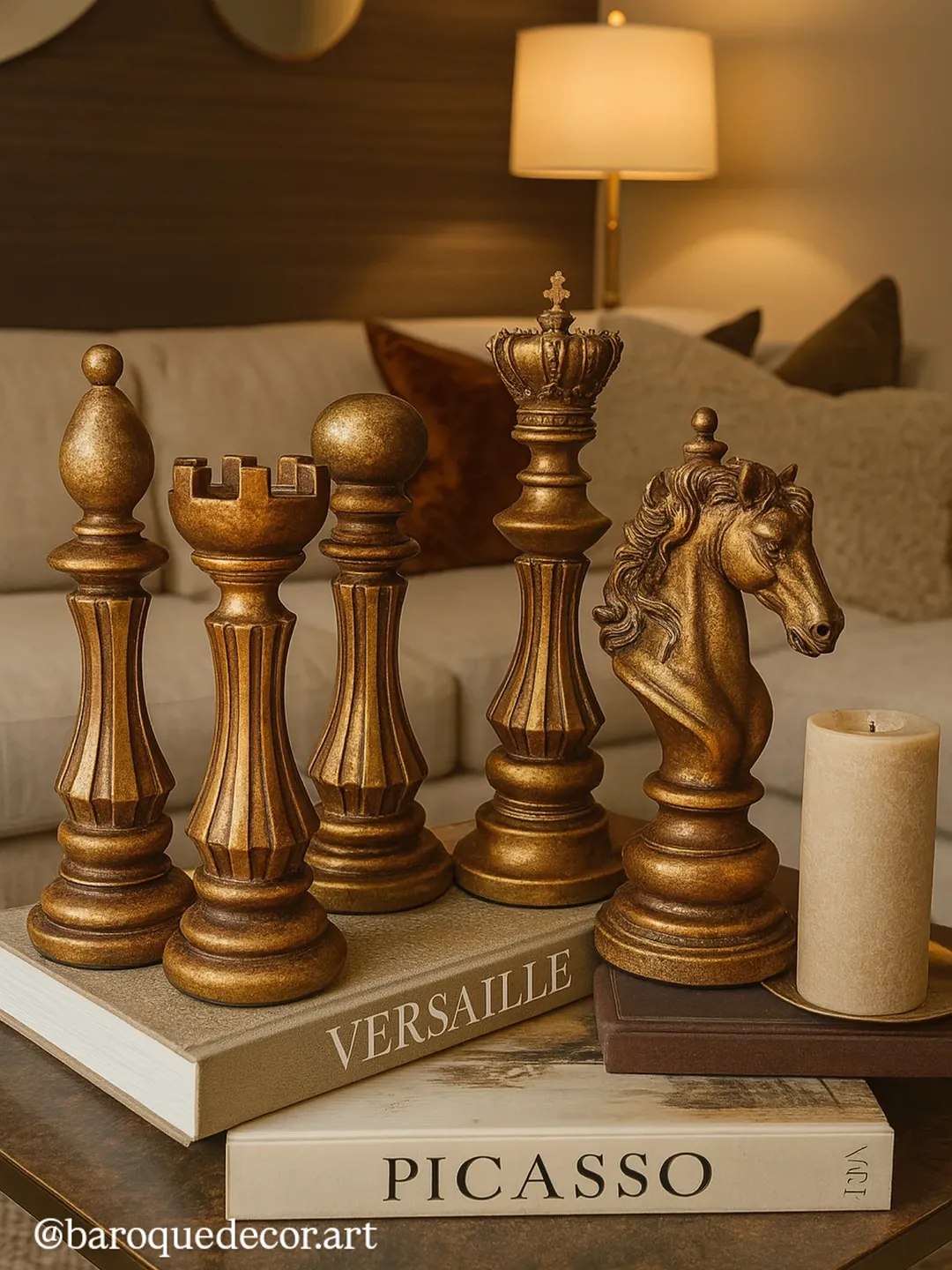 سه مهرهی شطرنج با رنگهای طلایی و قهوهای، روی میز چوبی گرم، کنار شمعی روشن و کتابی از دل تاریخ—ترکیبی که فقط یک دکور نیست، بلکه یک حسه. حسی از قدرت، زیبایی و داستانهایی ناگفته.